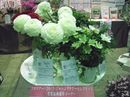 フロリアード2012のジャパンフラワーセレクション受賞品種紹介コーナーもありました。フロリアードは10年に1度、オランダで開催される国際園芸博覧会です。左が中庭・屋外の鉢物部門1席のクレマチス”北浜”、右が球根部門1席のラナンキュラス”ビガー・ホワイト”です。
