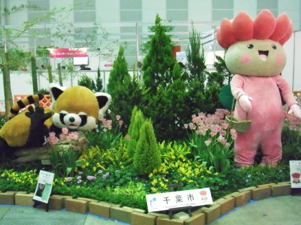 千葉市ブースは『花とひとのネットワーク実行委員会』の展示がありました。今年も花のあふれるまちづくりシンボルキャラクターのちはなちゃんがいましたよ。その横には千葉市動物公園のレッサーパンダ風太くんが。