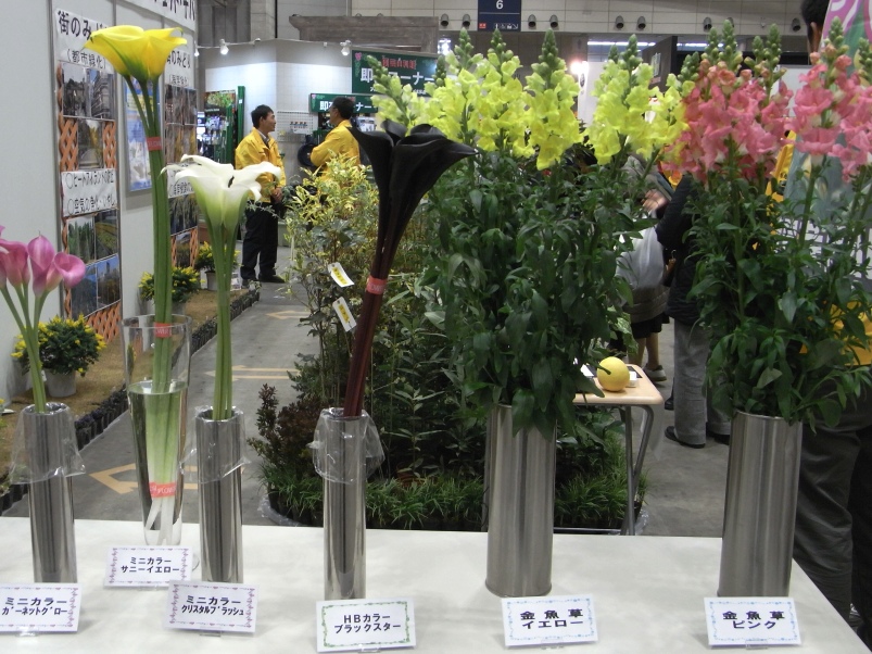 こちらは切花とフラワーアレンジメントを展示していました。写真は切花です。カラーがきれいでしたが、中でもHBカラーのブラックスターが目を引きました。茎までブラックです。ブラックスターは園芸総合ショップ『国華園』のウェブショップが球根を販売しています。下の商品画像かテキストをクリックすると詳細ページに移動します。