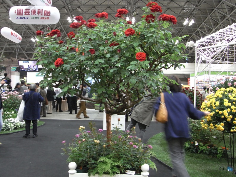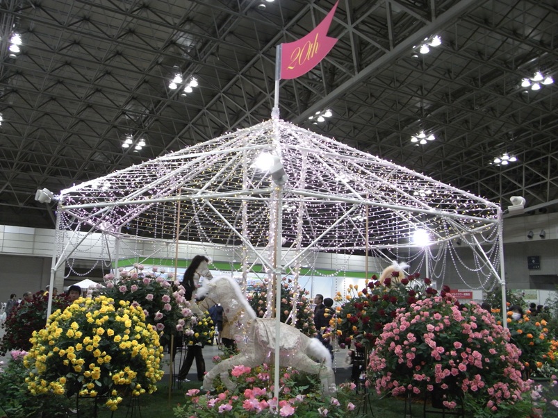 今回は「第20回日本フラワー&ガーデンショウ」のローズゴーランドの写真を載せます。ローズゴーランドは第20回のシンボルフラワーであるバラの展示コーナーです。会場の中心にロースガーデンを設け、そのセンターの位置にはメリーゴーランドを模したガゼポを配置しています。ガゼポはバラの切花アレンジメントで装飾し、ガゼボのまわりには通常開花よりも約2ヶ月も早く開花させたスタンダード仕立のバラや世界各国のバラが国ごとに植栽されました。