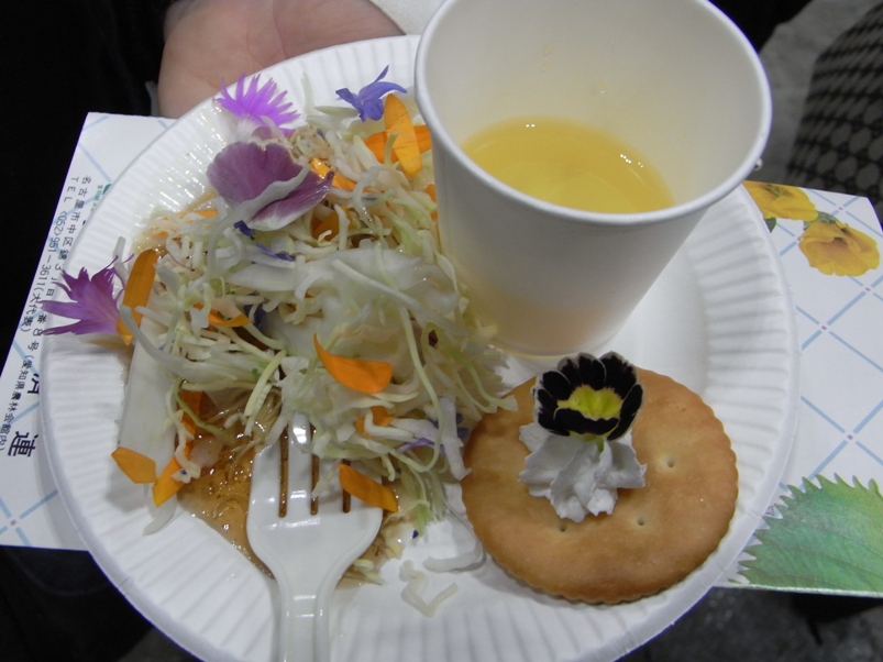 画像をクリックすると大きいサイズで見る事ができます。体験するイベントは色々あったんですが、私達はここだけ参加してみました。上の写真はエディブルフラワーを使用したデザートなどの展示品です。長いテーブルのはしに展示してあり、このテーブルにそって歩きつつ、エディブルフラワーのサラダやカナッペ、クッキーを受け取ります。受け取ったのが下の写真です。写真には写っていませんが袋入りのクッキーもありました。エディブルフラワー、とてもきれいですよね。味も苦味などあまり感じなかったので、食べやすいと思います。ヨーロッパでは古くから用いられたエディブルフラワー。日本ではまだ普及してはいませんが、レストランやホテルなどで用いている所もあるそうですよ。