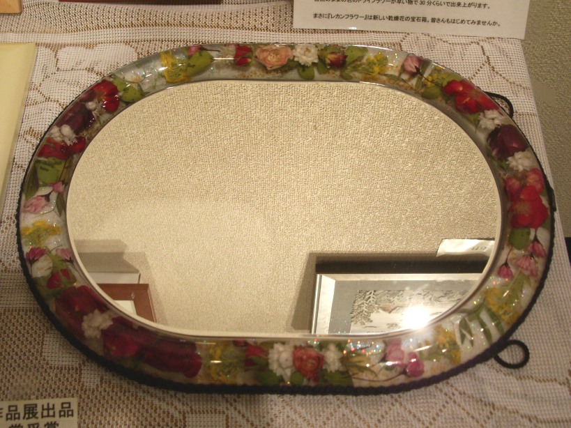 作品展に展示したバラのレジンフラワーの鏡です。レジンとは樹脂の事で、レジンに花を入れたものをレジンフラワーといいます。こちらはバラを主体にドライフラワーをレジンに入れています。