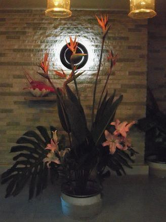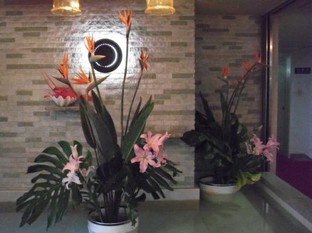 花はユリとストレリチア・レギーネ、葉はモンステラですね。ストレリチア・レギーネは和名の極楽鳥花で良く知られていますよね。鳥の極楽鳥に似た花を咲かせることからその名が付いたそうです。バード・オブ・パラダイスという別名もあります。どことなくユーモラスでいて華やかな花でした。ユリは美しくて香りが良かったです。モンステラは大きくてカッコ良かったです。