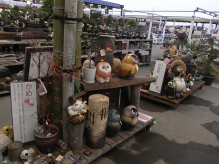 オーナメントは屋外の売場のあちこちにありました。こちらは狸・梟・亀ですね。アンティコテラコッタという鉢もずらっと売っていました。女の子の形の鉢が可愛かったです。