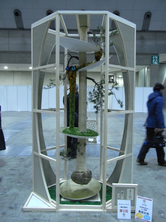こちらの作品も花器もアレンジもそれぞれユニークですよね。タイトルは上から「ヒカリへ」、「芽生えを探していたら森に迷いこんでしまいました」、「生まれいずるもの~朽ち果てるもの」、「芽吹き~くり返すいのち~」、「恵みの木」です。「恵みの木」は第2位の作品です。洒落たデザインでカッコイイですね。