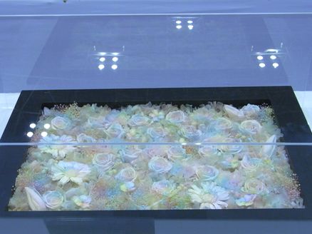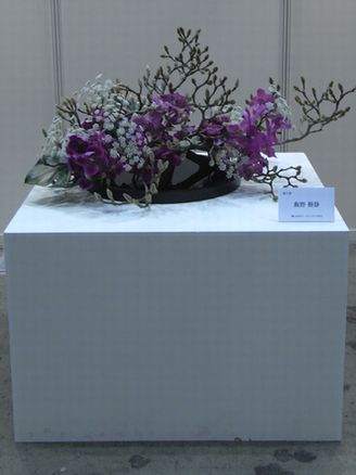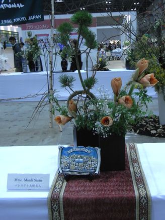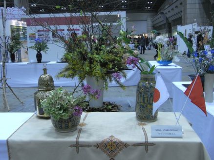 こちらも大使夫人の作品です。置物や花器がやはりそれぞれの国のものなのでしょうか、とてもきれいですね。作品も涼やかで素敵です。いけばなという日本の芸術と、それぞれの国の飾りや置物、そして花器が美しく融合していてまさしくインターナショナルでした。
