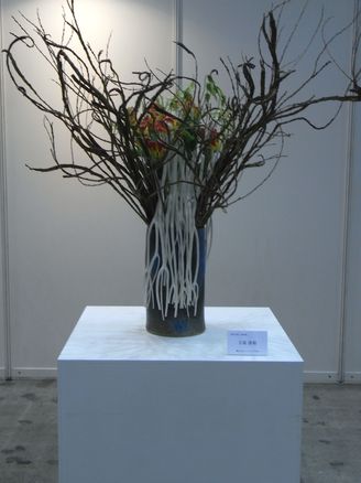 こちらもバッと炸裂する様な迫力がありました。花の美しさでも目を引きました。まるい花器がどことなくユーモラスで、作品に楽しい雰囲気をプラスしていました。