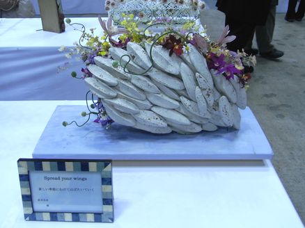 こちらの作品は殻か皮か、硬そうな物を使用した花器がユニークですね。上の作品のタイトルは「春てまり」、下の作品は「Spread Your Wings」です。