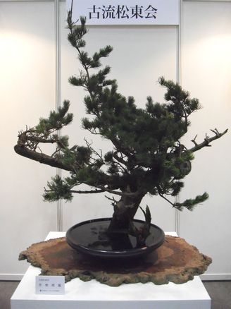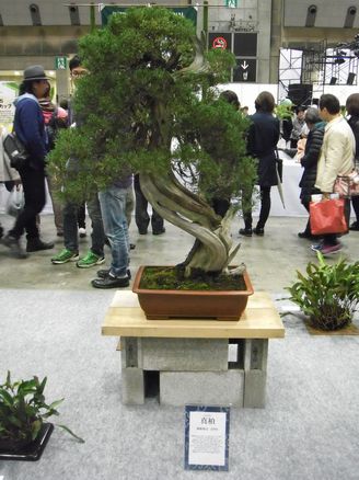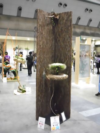 いけばなインターナショナルは、”Friendship throgh Flowers-花を通しての友好”をモットーに本部を東京に置き、世界53の国と地域に約7,600人の会員が日本の伝統文化いけばなを楽しんでいます。今回は海外会員を交えた展示を行っています。インターナショナルということで、奇抜な作品や洋風な作品も多いんですが、こちらは日本の会員さんの作品ということもあってしっとりとした和風の作品ですね。箱の使い方が洒落ています。次は日本の伝統-盆栽・伝統園芸植物の展示です。まずは展示コーナーにあった木の化石です。